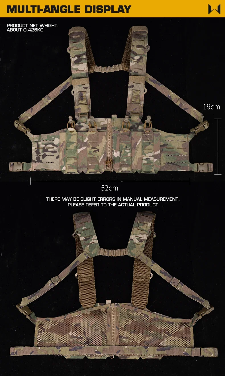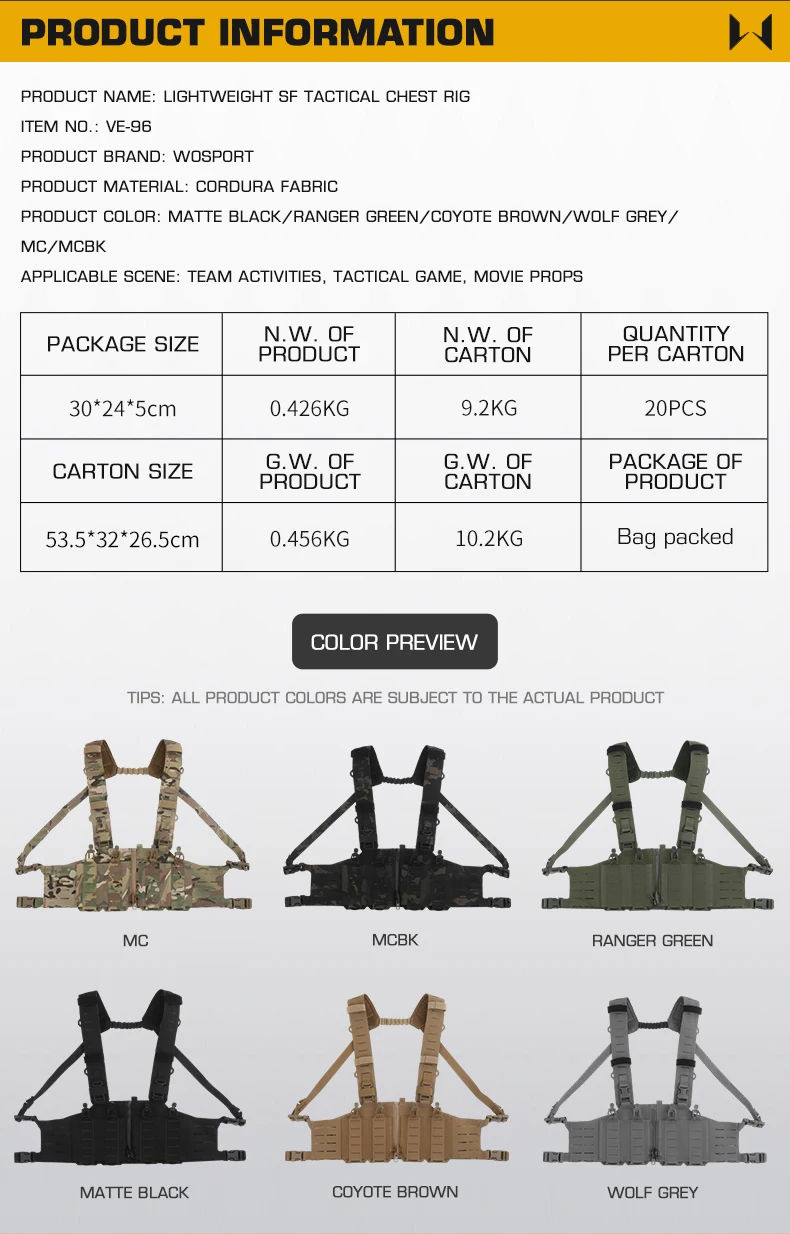 SPECIFICATIONSApplication: Outdoor equipment, movie propsBrand Name: YTYINCN: GuangdongColor: Black/Ranger Green/Wolf Grey/Coyote Brown/MC/MCBKFit: True to SizeGender: MenHigh-concerned chemical: NoneMaterial: Nylon,Cordura FabricOrigin: Mainland ChinaPackage: Bag packedProduct name: Cordura Lightweight SF Chest RigSeason: Spring,Summer,Autumn,WinterSize: 30*24*5cmWeight: 0.426KG Cordura Lightweight SF Chest Rig Quick Release Outdoor Chest Hanger With MOLLE System Hunting Accessories  Product...